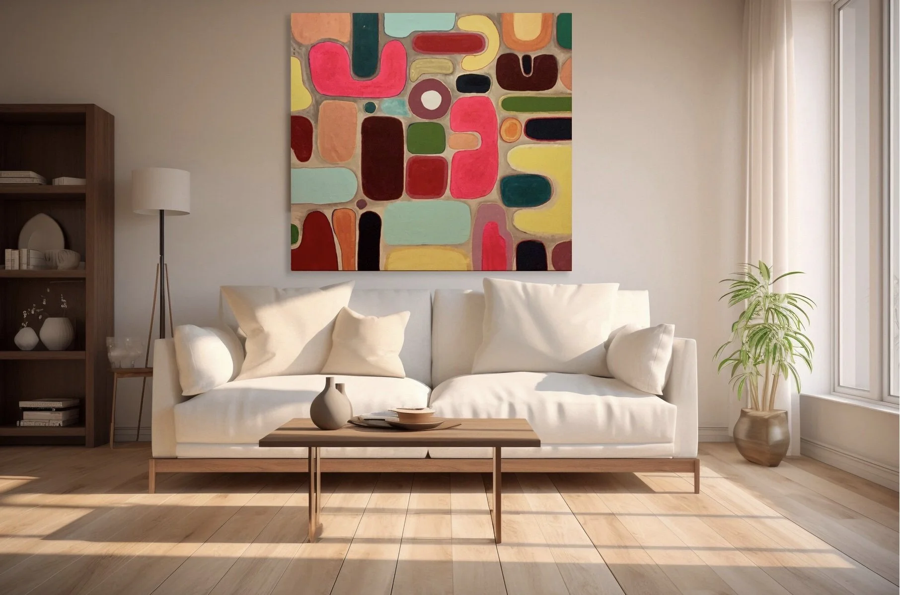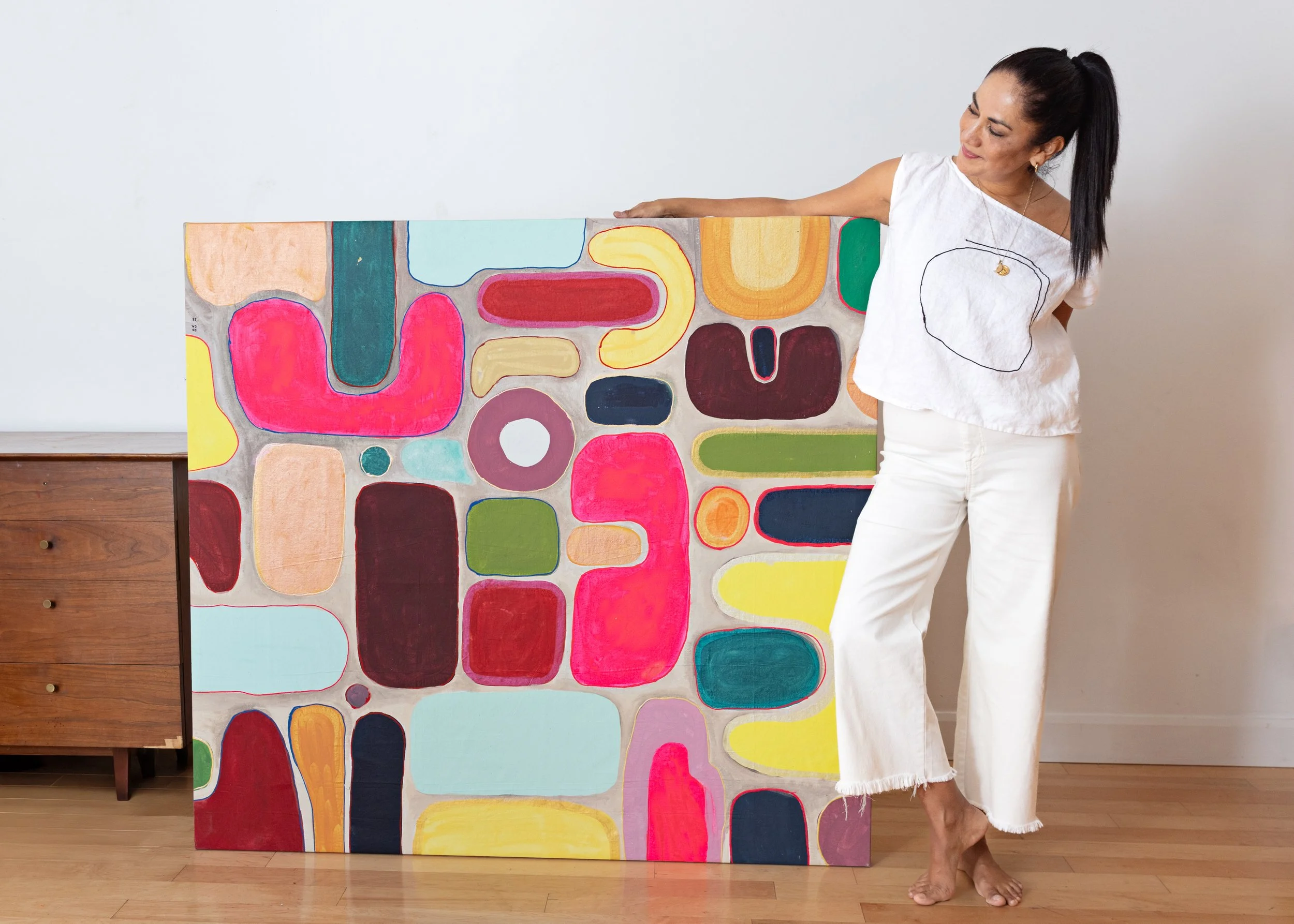 Mon parcours en design graphique influence profondément mon travail pictural. La sensibilité à la composition, au rythme visuel et à la puissance de la couleur nourrit chacune de mes œuvres. À cette structure héritée du design se mêle un processus intuitif où les formes organiques émergent librement.