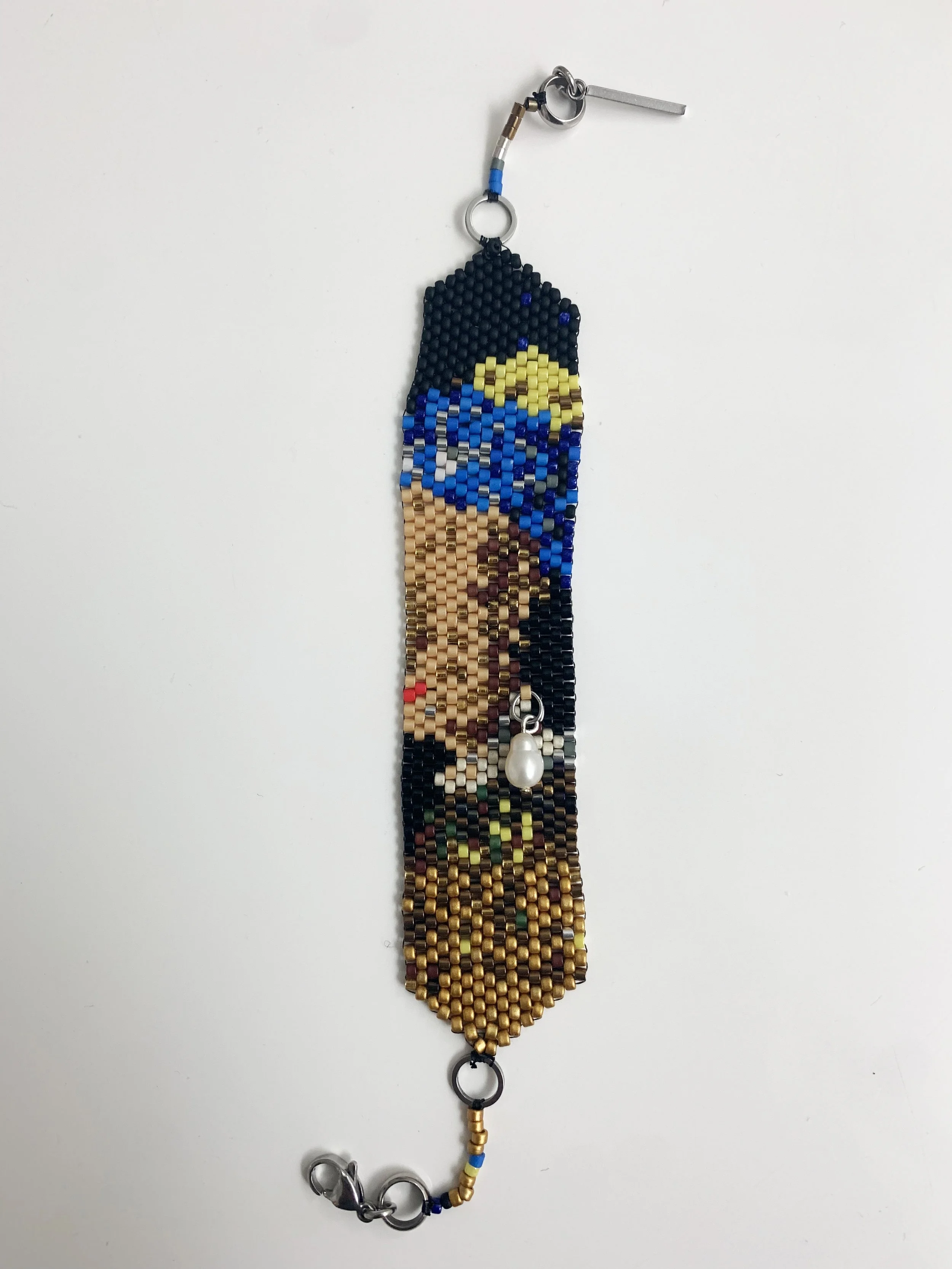 À travers le tissage minutieux des perles, on retrouve une évocation subtile du regard et de la lumière qui caractérisent l’œuvre. Les nuances de bleu profond rappellent le turban iconique, tandis que les tons chauds: sable, ocre, doré, suggèrent la douceur de la peau et la chaleur de la lumière.